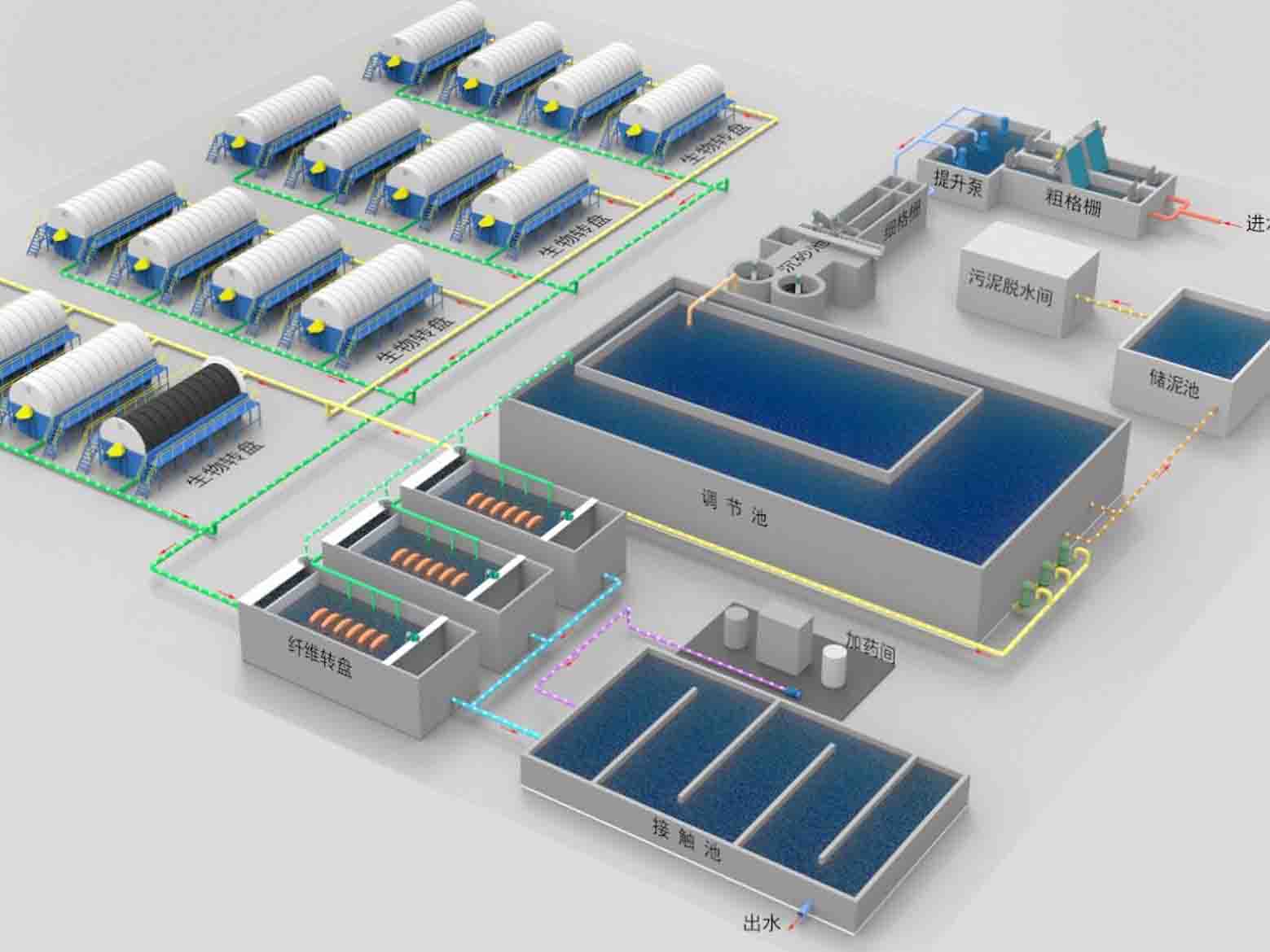 ◇ 固液分離→水解酸化池/調節池→氣浮機→ABR折流厭氧→接觸碳化→接觸硝化→高效沉淀→多介質過濾器/脫泥→消毒→達標排放;