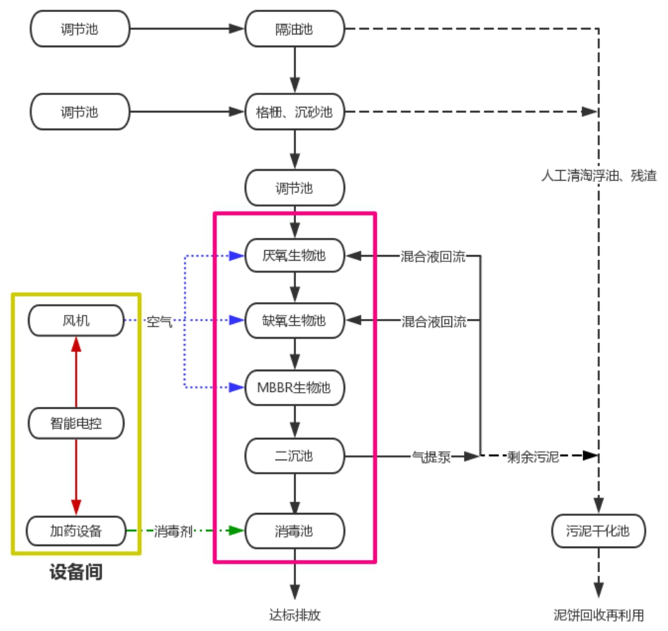 1 隔油池:廚房含油廢水排入隔油池,對污水進行隔油預處理,有助于后續處理工藝的正常運行;